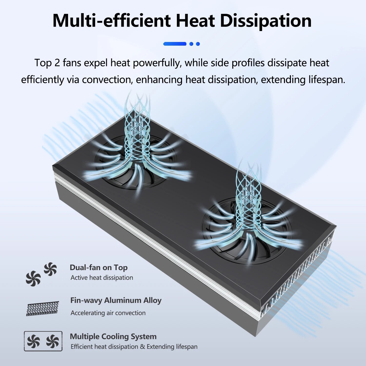 - Cool and quiet operation: Dual-fan cooling with an aluminum heatsink for efficient heat dissipation (low-noise design).